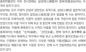 충현박물관의 야외 전시장에는 풍욕대와 삼상대라는 두개의 정자가 있습니다. ‘바람에 목욕한다’ 라는 뜻을 가진 풍욕대는 여름에 서해의 해풍으로 인해 그 시원함이 더해지는 곳입니다. 단칸짜리 정자에 불과하지만 소슬하게 자리잡고 있는 풍욕대는 맑고 깨끗한 자연과 동화되고자 했던 양반가의 풍와 멋, 여유과 기개가 아우러져 있는 곳입니다.